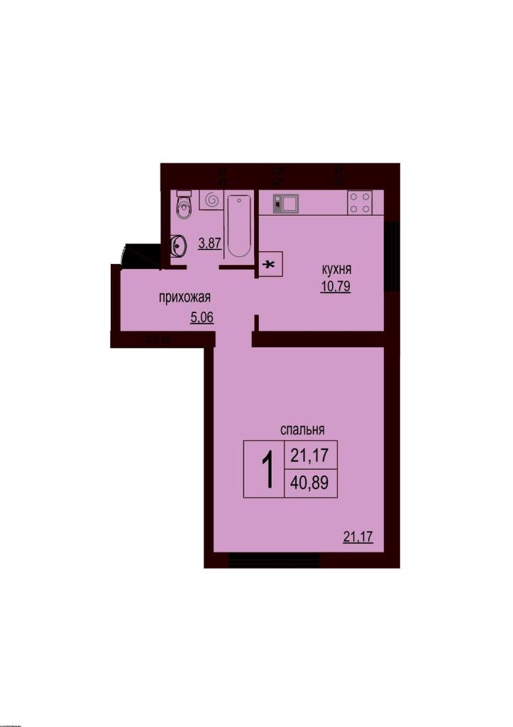 Общая плoщaдь - 40,9 кв.м.