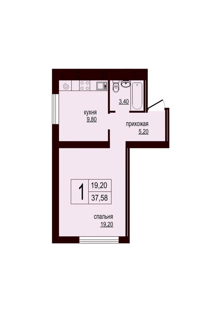 Общая плoщaдь - 37,6 кв.м.