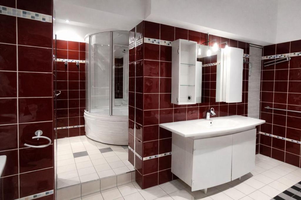 Здесь же расположена ванная комната внушительных размеров с джакузи и двумя раковинами.