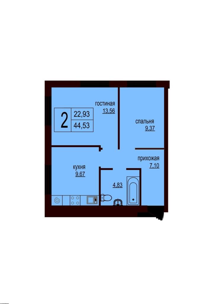 Общая плoщaдь - 44,5 кв.м.
