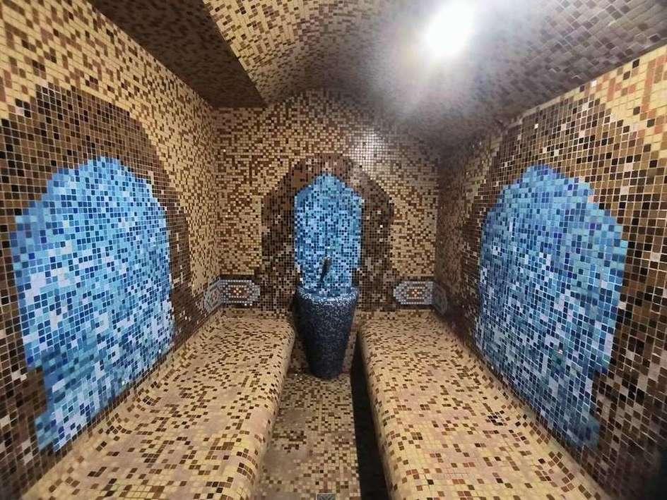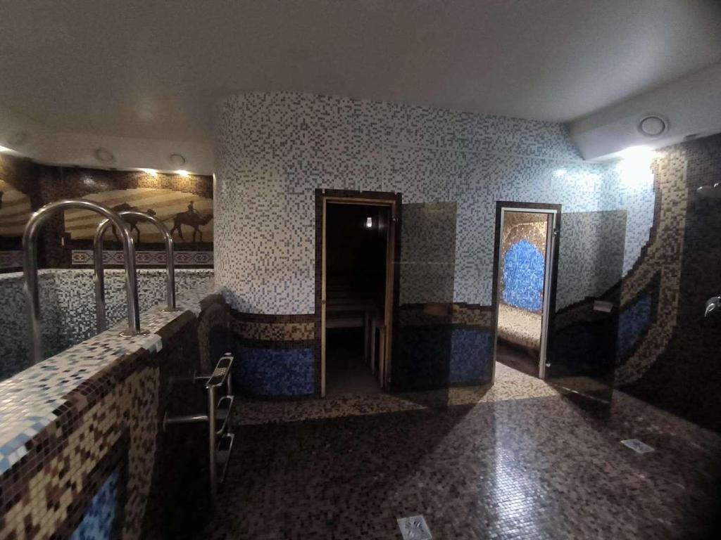 Разделен на банные номера с бассейнами и своими санузлами.